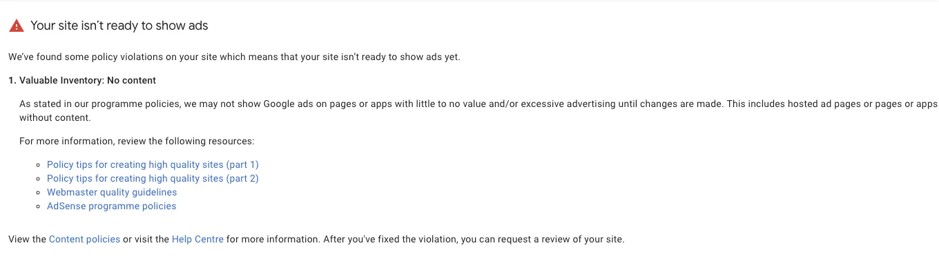I recently changed the domain of my site, which meant I needed to add the new domain to Adsense otherwise adverts would no longer display. However, after Google’s checks on my site, I received a notification that the site had failed validation since it had no content. This was slightly surprising, since the site was up and running, and Google were quite happy with it under a different domain.
